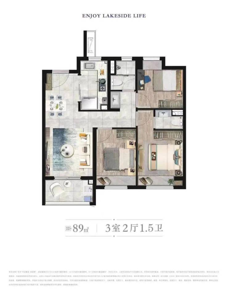 建面约89㎡三房两厅一卫(南北通透,客厅朝南)
