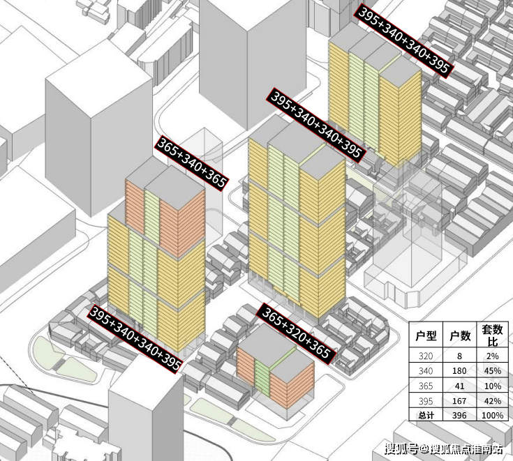 最小户型320平均位于西南角的9F洋房中,套数仅8套,其余则为340、265以及395的塔楼户型。