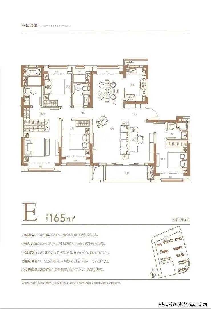 以建面约165㎡奢境户型为例,南向四开间面宽可达约16.2m,约6.2米宽厅连接宽幕阳台,突破性尺度设计,带来通透的全景视野,一眼望向城市自然与繁华,居住于此,大平层的尊崇奢居体验油然而生。