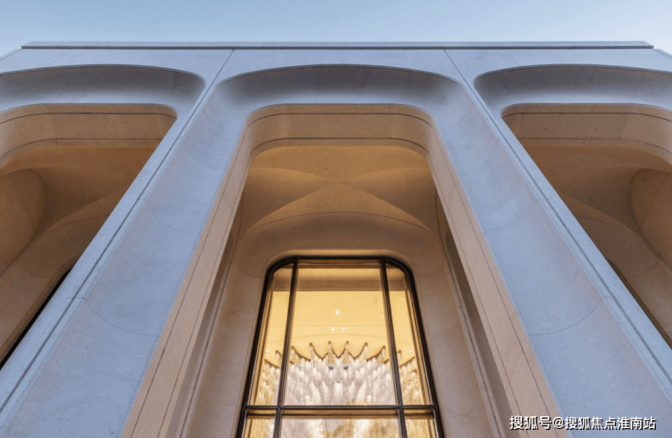 建筑底座选用了沉稳的贝金米黄石材,上部采用米白色仿石铝板,通过高精度转印呈现天然石材纹理,呈现一种上实下虚的灵动。