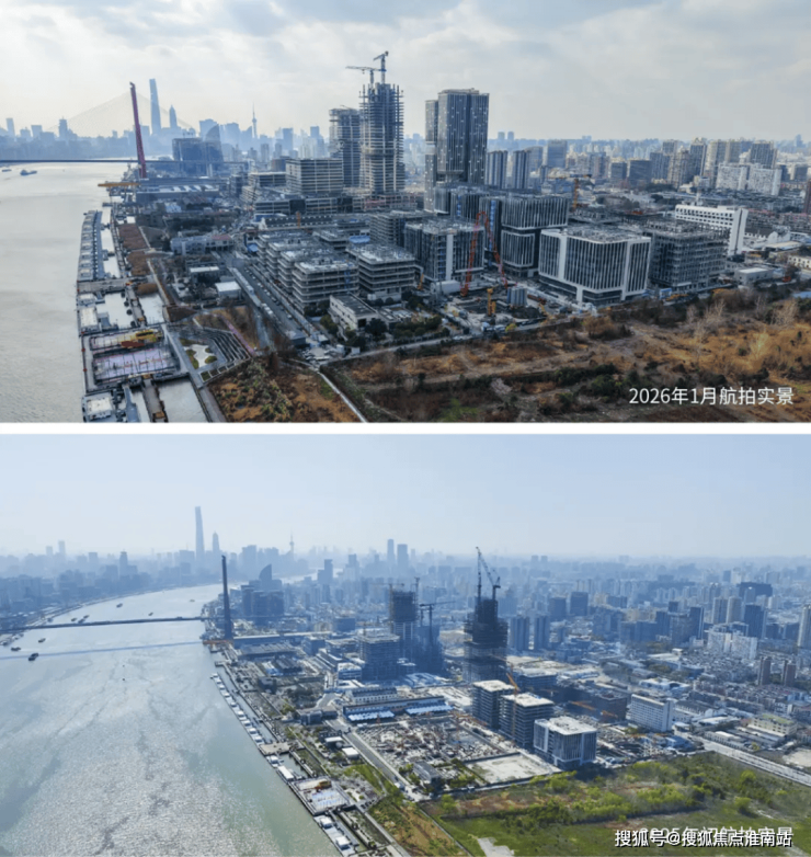 2026年初,杨浦滨江恢弘钜制已然实景呈现:(上图是2026年1月的航拍实景,下图是2025年初的航拍实景,直观去对比,建设速度确实快,变化很大)