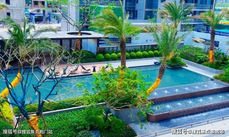 置身景观廊架之下,纵眼望去,东南亚棕榈科植物阵列其间, 约 183.5㎡ 亲子戏水池、酒店感礼仪水景相映成趣,绿荫草木、天光云影倒映于缓缓流动的水面上,宛若一幅立体的江山画卷,流动生活的无尽遐思。