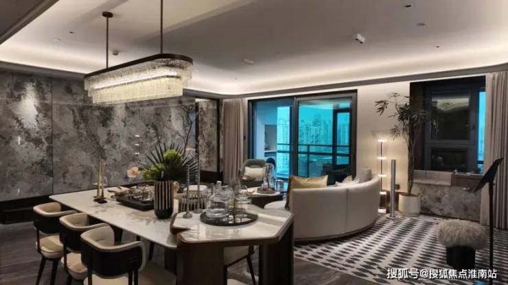 客厅以 整面雪山蓝岩板打造电视背景墙,地面采用1.8米×0.9米大规格地砖密拼,营造浑然一体的奢华氛围。