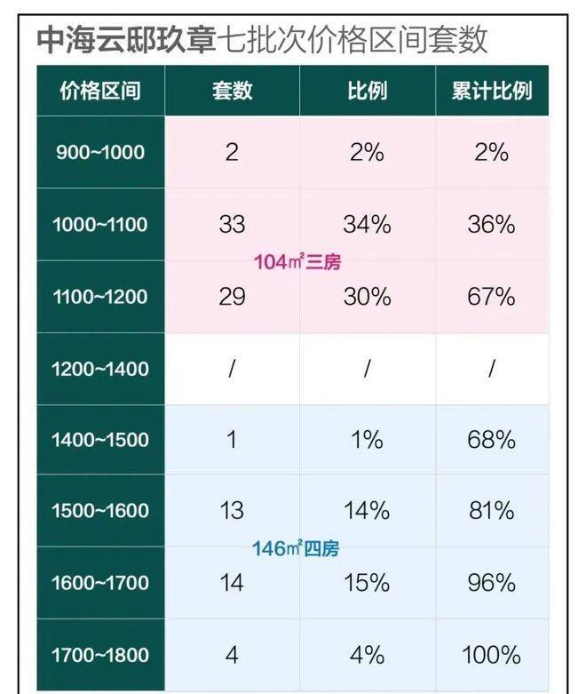 上图是根据对外公示的一房一价来统计的,104㎡户型有一多半房源是在1100万以内的,但如果再叠加新春优惠,104㎡总价几乎全部都在千万级范围内,这个价格就显得质价比很高了。146㎡户型主力总价则在1500~1700万左右。