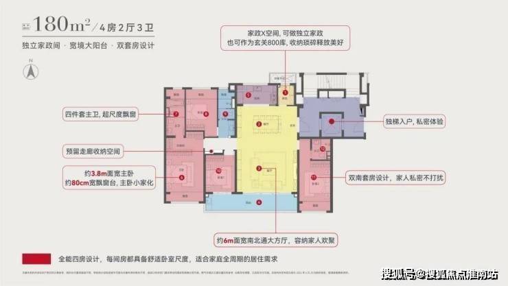 在优越的空间利用率面前,其它闪光点都成了锦上添花。但基本上市场大平层必备的要素,ta都有——标配大横厅、标配洄游结构、标配动静分区、真南北通透等等。