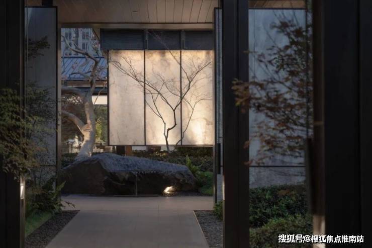 行至院落,忽闻清音袅袅,循声而入,绿意浓浓,精致窗门下感受幽雅的渗透空间。运用夹景的手法,左右两侧景墙加以屏障,使景观空间延伸至景观焦点,一树、一石、一光,叶疏影秀,小中见大。
