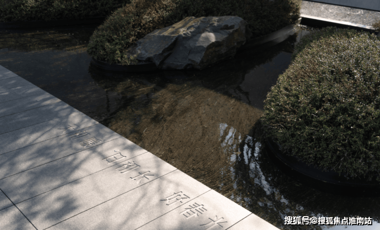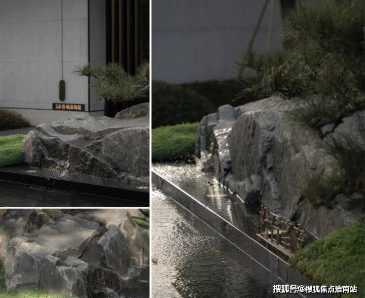第一幅通过景墙的框景,使人们的注意力集中在中心的景观上,一松,一石,一池水便是画卷,文石水墨、无边静水,寓山于水,一静一动,动静之间又有无限深意,如《姑苏繁华图》中的一处缩影,松石相望,流水相伴;入口设置了三步台阶寓意:云接三级,步步高升,此外营造了两幅长卷画面。