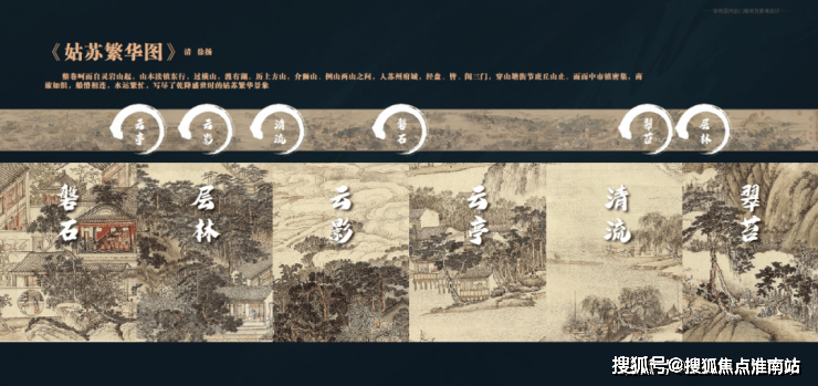 项目参考《姑苏繁华图》为背景,将清代苏州城的繁华盛况融合现代景观元素,提炼出「磐石、层林、云影、云亭、清流、翠台」六大场景,每个区域都展现着独特的设计理念和艺术氛围,并传递出居住环境的生态氛围。