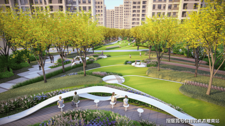 公园+花园的双园社区、品质归家入口、特色阳光草坪、双会客系统、主题儿童乐园、健身系统六大功能价值叠加由三条不同主题的林荫步道和三个圆形景观节点组成的全区漫步系统,共同构建“6+1”森O₂家园。