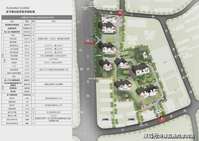 而北侧靠近南山路一侧还规划一幢最高6层的养老设施用房.在小区南北两侧的中华新路和南山路分别设有机动车出入口.