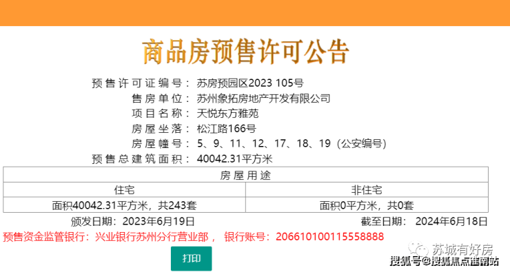 开发商:苏州象拓房地产开发有限公司。天悦东方雅苑售楼处电话:400-9659-259项目备案名:天悦东方雅苑。预售证:苏房预园区202357号、苏房预园区2023105号