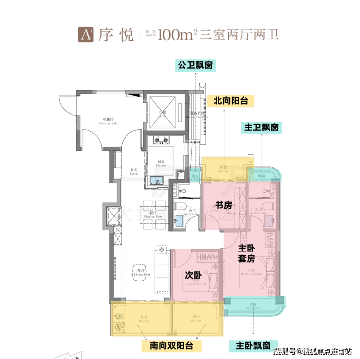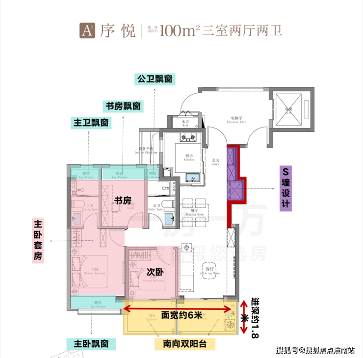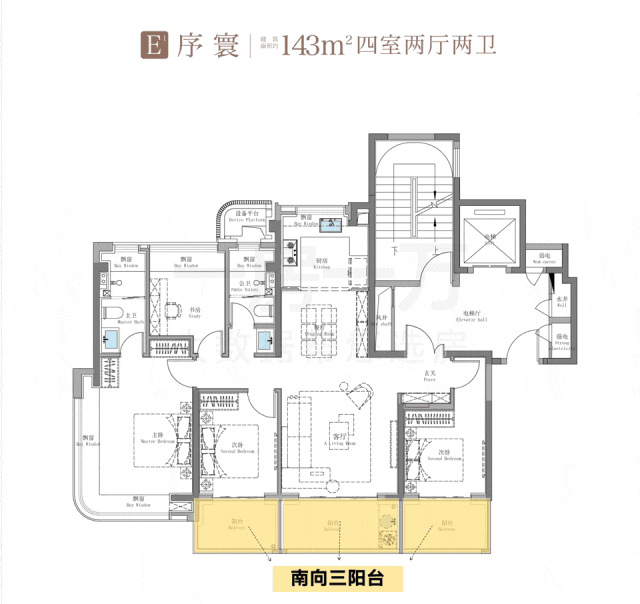 建面约100㎡A3户型配置了约1.8米进深的豪华双南大阳台,主卧、主卫、书房、公卫也都做了飘窗设计。