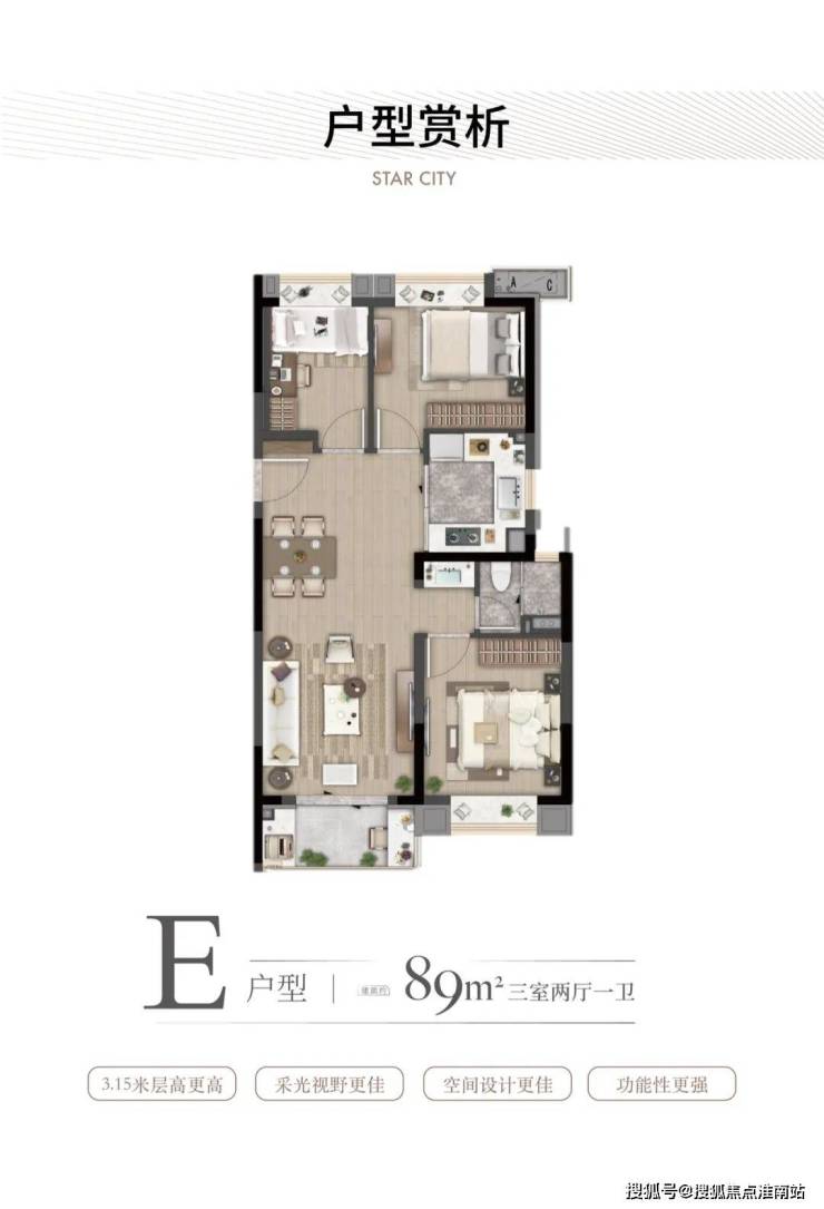 · 约89㎡户型:大虹桥范围不到90㎡的户型大部分都只做到2房,灿耀星城该面积段实现 3房功能性,让自住客户一步到位,也让该产品进入二手市场后具备降维打击的优势!