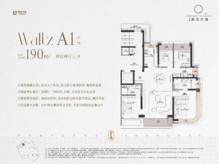建筑面积约190㎡户型在空间规划与居住体验上毫不妥协,完美平衡实用性与奢适感。户型采用经典三开间朝南设计,搭配超尺度全景玻璃,让阳光与城市盛景无界涌入室内,推窗即可俯瞰园区景观,尽享市中心庄园草坪的惬意生活。