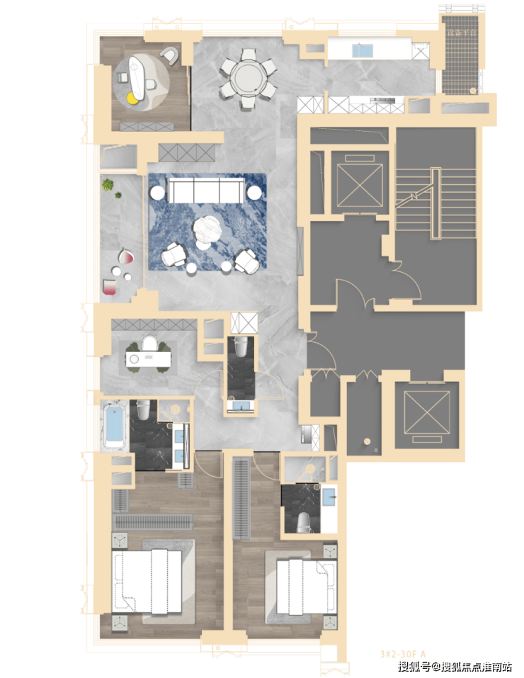 户型优选南北通透方正布局,开间与进深比1:1.5为佳,避开暗卫设计。