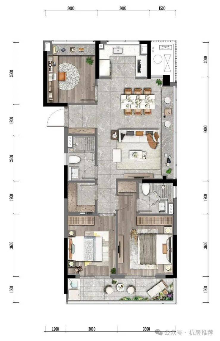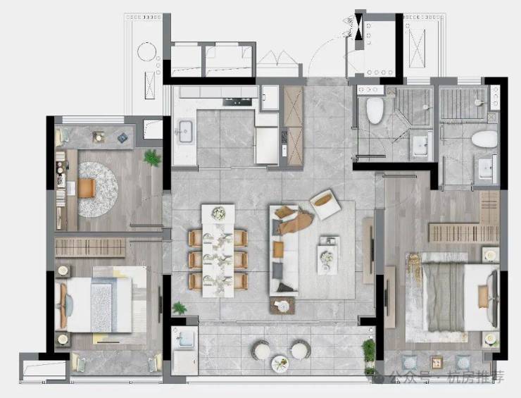 125㎡四房两卫同样是边套:三个卧室均排列在南侧,充分实现了“阳光平权”,每个家庭都可以沐浴在阳光中醒来。LDBK一体化的公区,充分实现了家庭成员间的互动;除了边厅外接的阳台外,南向次卧同样设计了阳台,兼顾了景观和晾晒的需求