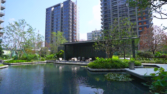 潮映望月府8幢16-26层的高层,采用围合式排布,形成一个内向型的中央主题景观,面积达到约5000方,整体以“一廊三心九园”的规划理念出发,其中的“一园”曲桥风荷,灵感来源于杭州西湖十景之一的曲院风荷,近水平台与中央景观相连,不规则的边界更像是蔚蓝梦幻岛,搭配下沉式休息区,将景观与功能空间巧妙结合。