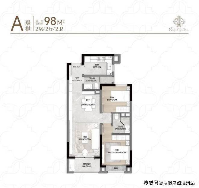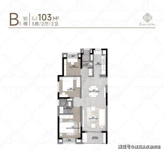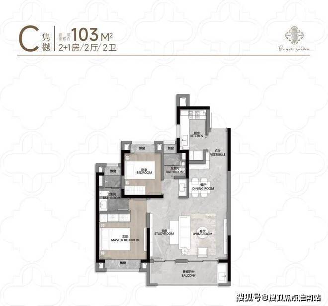 户型得房率75-79%(高于市面74%),建面约98-104㎡三房实现“小面积多功能”(如270°阳台、双套房设计);