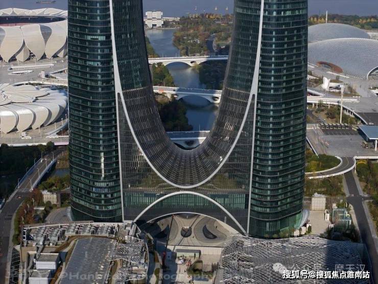 杭州之门双塔朝向远处的钱塘江和利民河,与周边的市民中心、莲花碗、杭州国际博览中心、日月同辉等核心建筑群打造一个“七星拱月”格局。