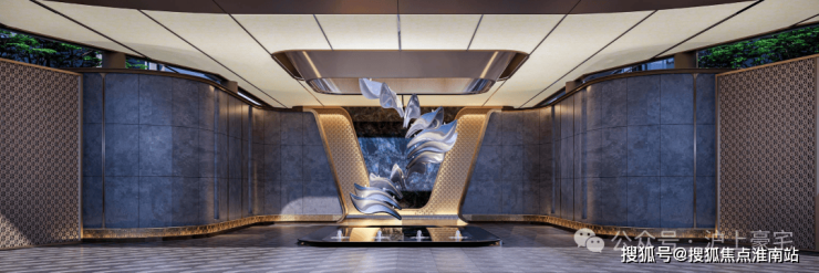 臻奢寰宇×艺术×超尺度,约95米城市超级界面·双重归家礼——蓝翡翠镜面奢石烘托,奢舞流转艺术雕塑。