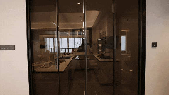 「招商中旅·揽阅」售楼处电话:400-965-9259【预约热线】☎● 厨房:接着往里走,来到厨房,铝合金边框茶色玻璃移门,采用上轨道设计,没有下轨道长时间变形的困扰,加上采用750*1500大砖的地面,显得整体美观且容易清理。