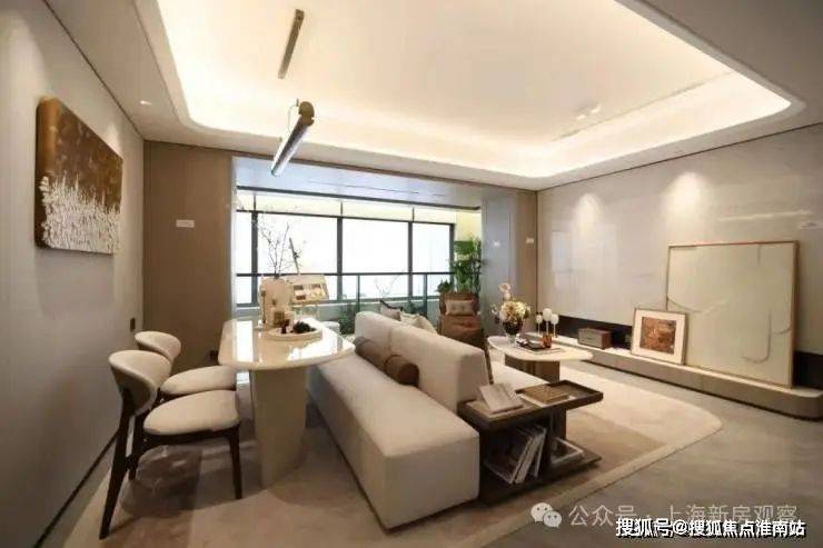 「招商中旅·揽阅」售楼处电话:400-965-9259【预约热线】☎● 客餐厅:客餐厅地面同样采用了750*1500的大砖,电视背景墙采用浅色大面岩板。顶部采用弧形石膏板吊顶+四边反光灯槽(圆弧角)+吸顶灯+磁吸轨道灯,使客厅空间在视觉上显得更加宽敞。