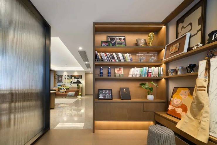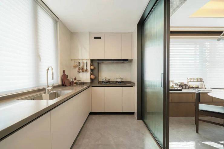 前排一线湖景楼幢, 约12.4米超大面宽、 四开间朝南。实体样板房的餐厅在做了双排餐边柜后,座位依然阔绰。厨房也非常自信的放入了双开门大冰箱,对喜欢屯各种生鲜食品、饮料的年轻人来说真是心头好。