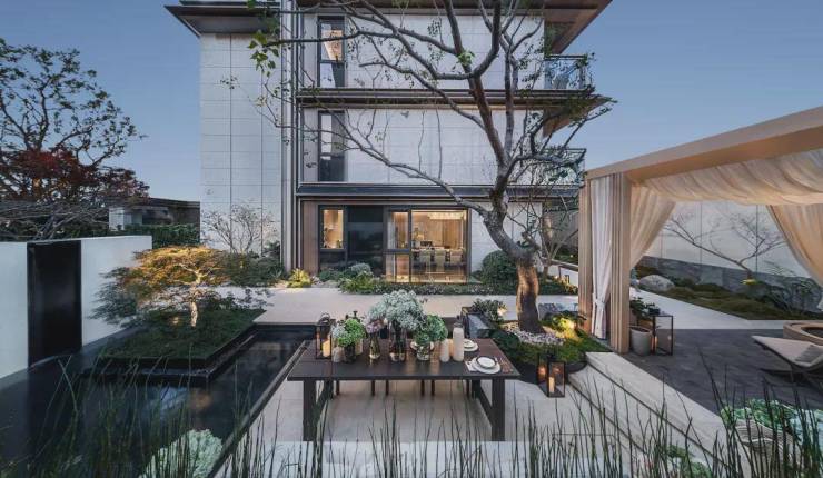 外立面同样使用到石材,大面玻璃及落地窗,搭配铝板和中空LOW-E三玻两腔,既美观,又和东方美学园林相得益彰。
