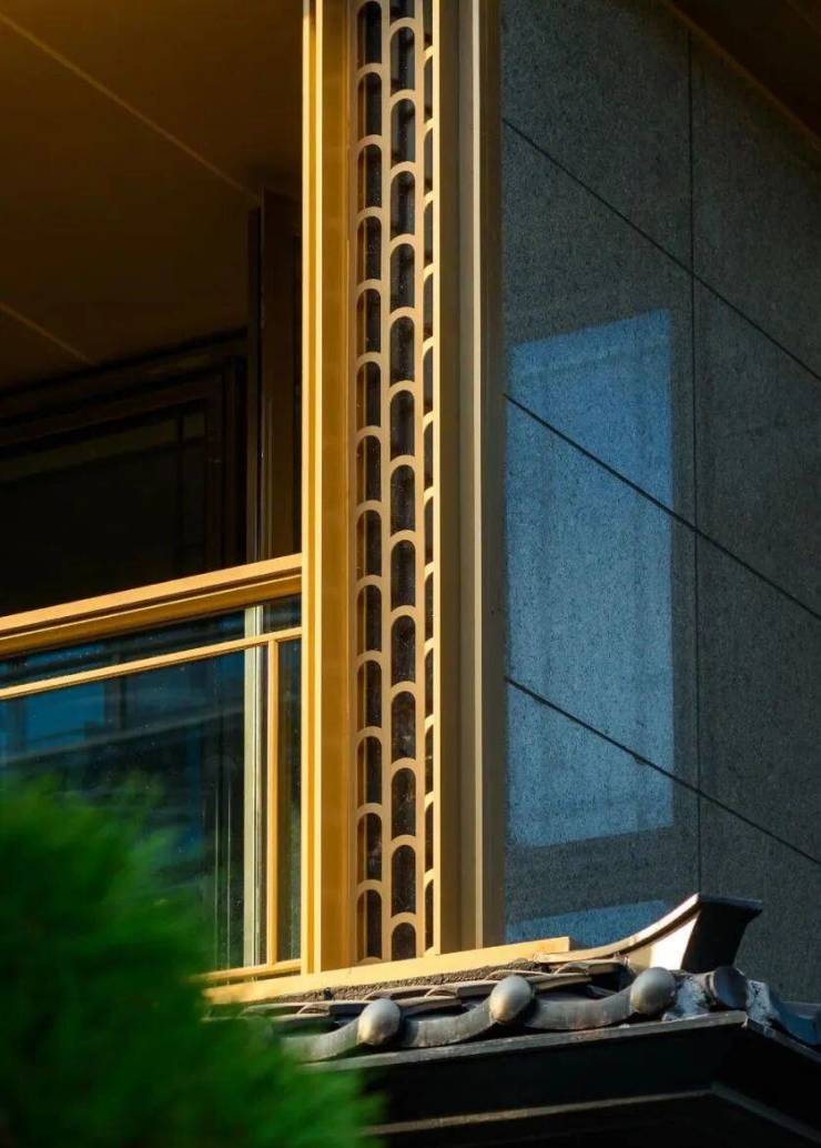 三重屋檐,代表天地人融合的东方宫殿最高等级,上檐、外檐、下檐三重结构,现代立面,以铝板、格栅、石材、瓦墙型材、玻璃等现代型材,彰显传世之宅的独特气度。