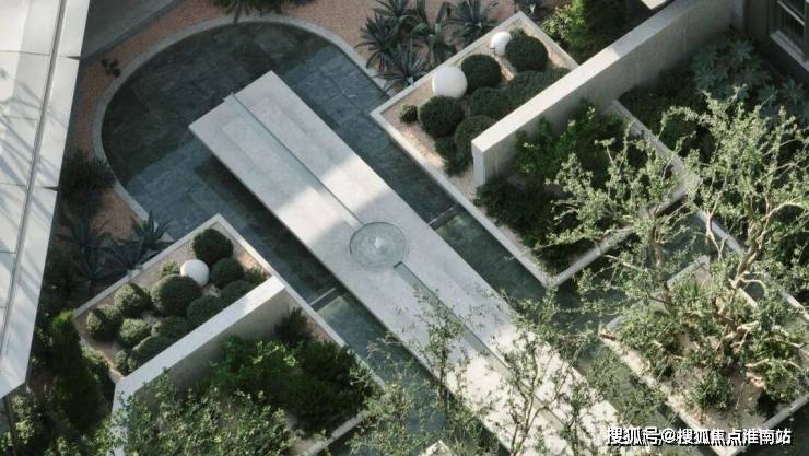 绿宝石花园以莫奈《睡莲》为灵感,打造约30米长的水景花园;林间溪谷则采用椭圆水池设计,汲取克罗耶《斯卡恩的夏日傍晚-海滩散步》的艺术意境,营造水景与休憩空间的交互体验;城市露台位于6号楼下,面向中兴公园,异域植物环绕的阶梯提供从高向低的景观视野,塑造城市与自然的层次感.