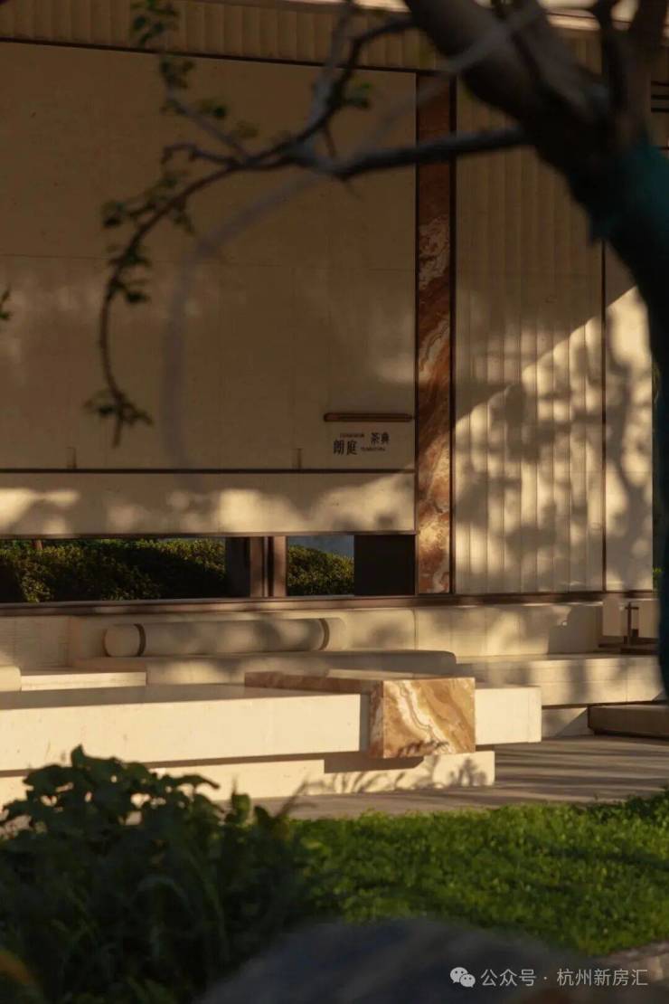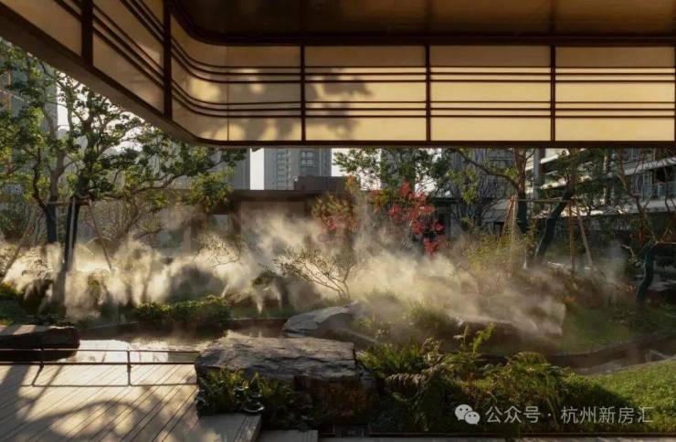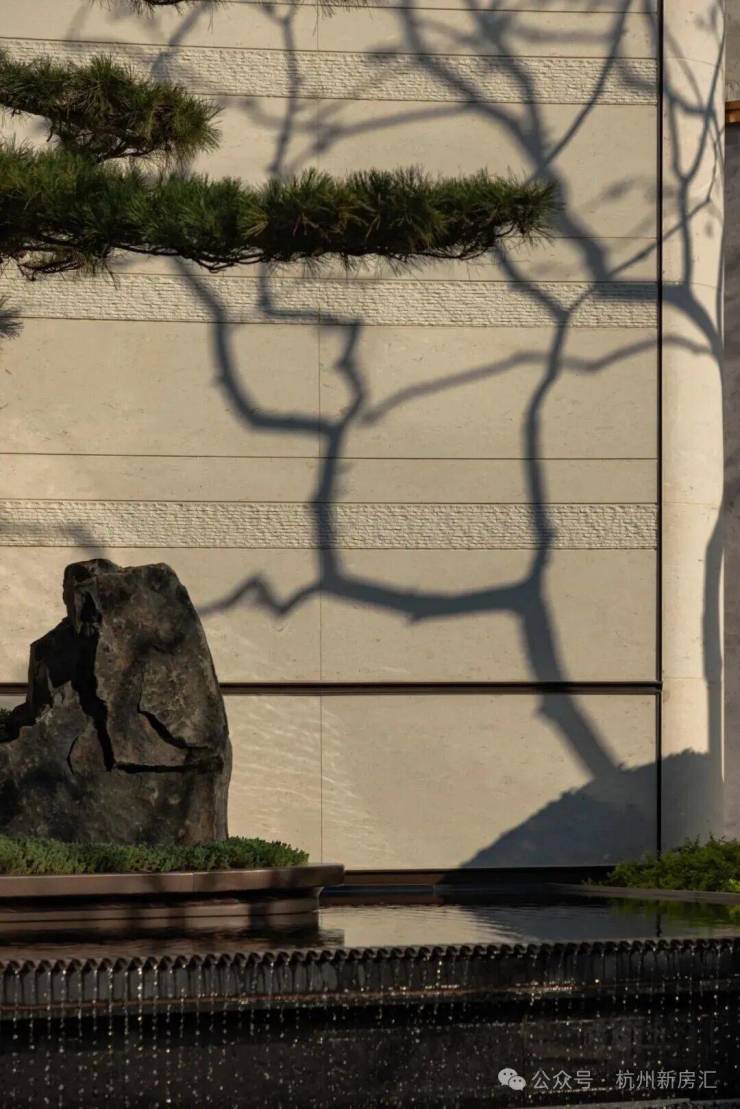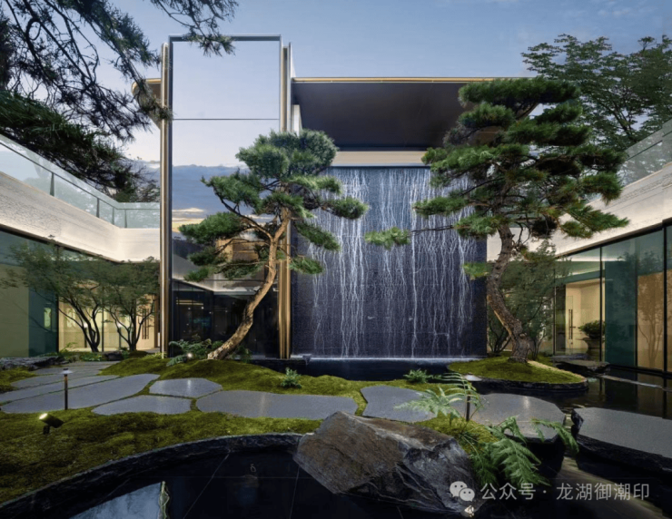 御潮印的下沉式园林打造了世纪城独一份的约300㎡飞瀑松院。园林中央精选多棵名贵泰山松,高度统一近6米,运用全冠移植技艺,入园即是最佳观赏形态;不远处近6米高飞瀑倾斜而下,实现庭院三级叠水,瀑布声和叠水声混合成一曲自然乐章,动静结合,多了些赏玩之趣。