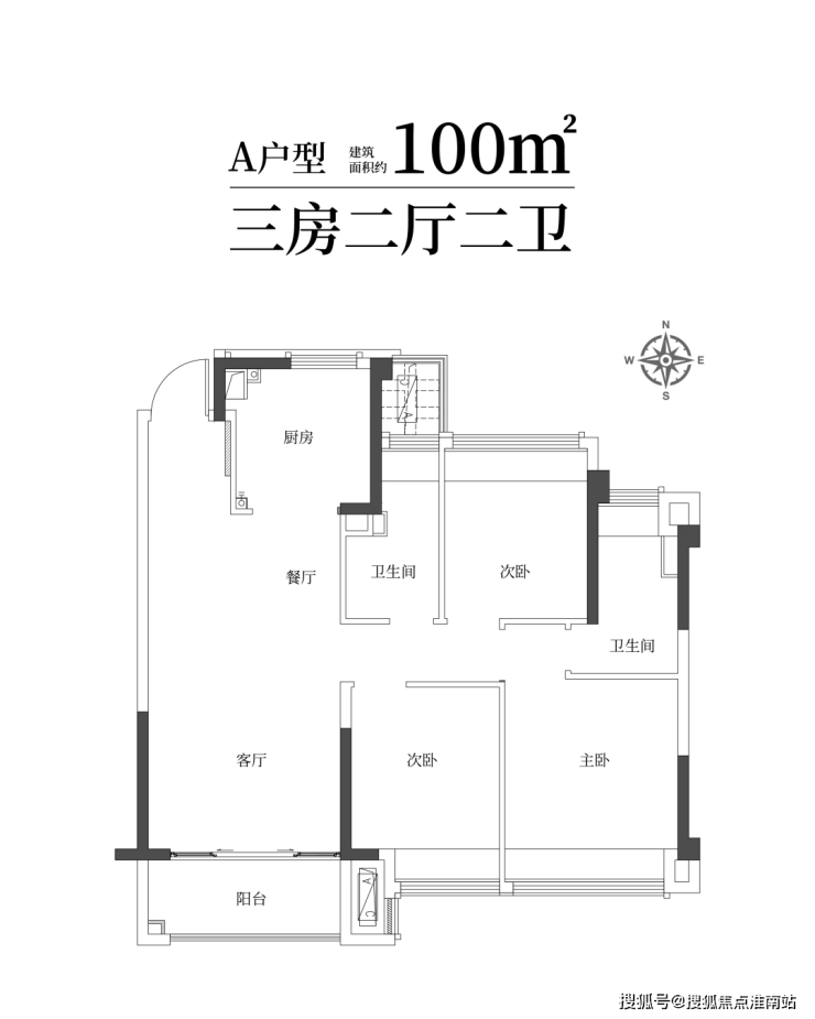 建筑面积约100㎡雅致三房两卫,满足二娃时代
