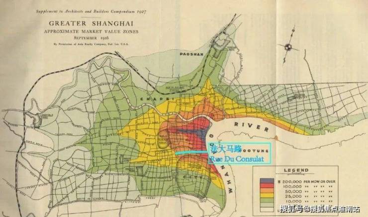 在讨论上海地段的时候,经常用来举例的一张1926年的地价图,如今在讨论嘉里金陵路项目的时候,重新溯源,金陵路的位置即地图上“法大马路(Rue Du Consulat)”的位置。当时来看,金陵路沿线属于第二梯段的地价,最深色的第一梯段的地价,即外滩、南京东路一线,从当时到现在都主要是商业办公组成。金陵路在住宅口径的角度去讨论,当时可以属于第一梯段。