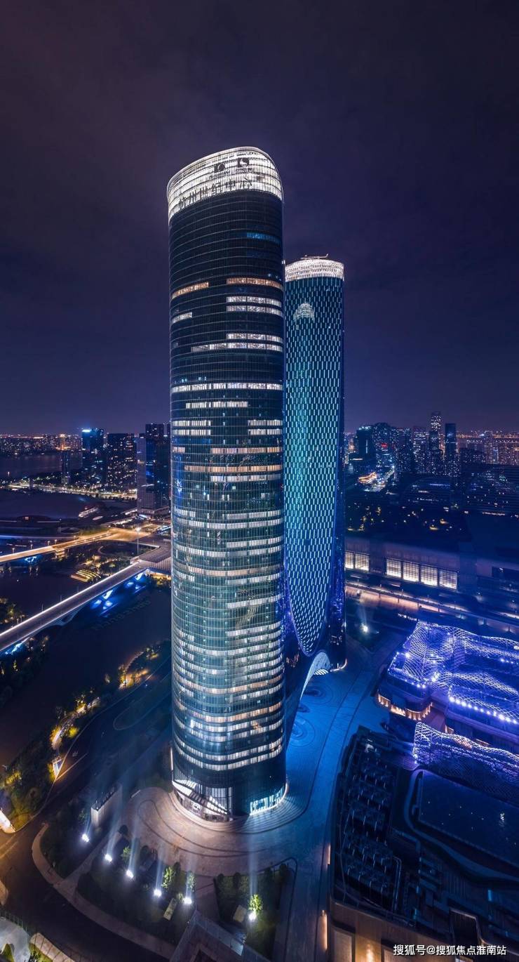 项目总建筑面积53.3万平方米,主体由对称的63层东西双塔组成,建筑高度302.6m,是集企业总部、综合商务、星级酒店、精品商场等功能为一身的综合体