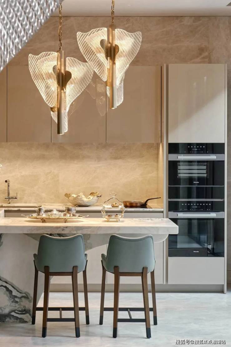 主厅核心区悬浮式定制柜体,银箔与丝绸在几何切割中构建中式基因,毕加索石材的天然裂变肌理成为天然艺术装置。瀑布吊灯以流体力学演绎东方留白,让光影在岩板表面生长出动态水墨意境。