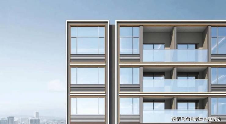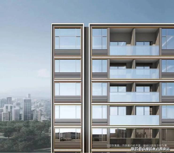 油画框立面:建筑立面汲取国际superflat超平美学理念,倾注绿城匠艺,以深灰色型材、香槟金线条与大面玻璃搭配,且沿主次干路住宅采用全封闭阳台,整齐划一的立面效果,革新西虹桥人居封面。