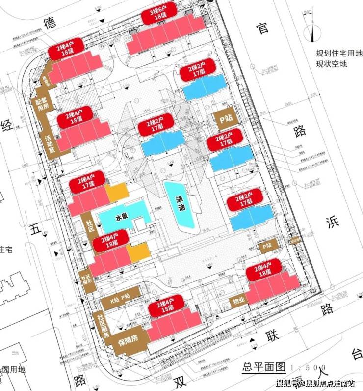 项目拟建11栋17-18层高层住宅,1栋保障房以及若干社区配套用房,部分楼栋带有连廊,社区内规划有水景和泳池。