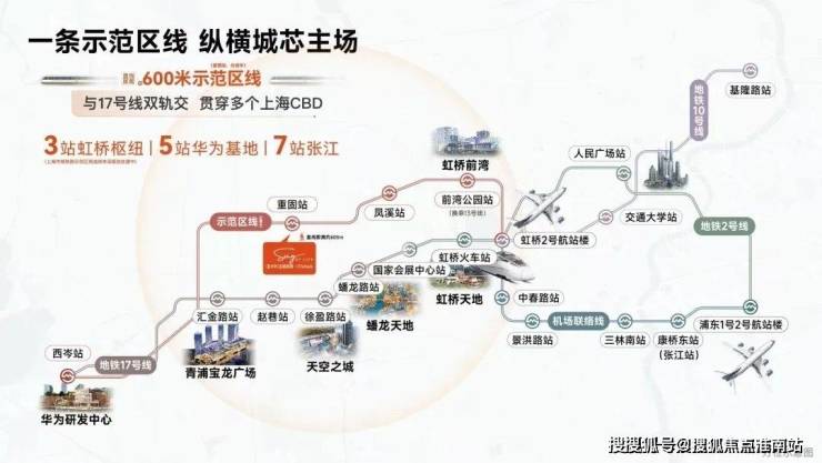 项目直线距离约600米即示范区线重固站(在建中),3站虹桥枢纽、5站华为基地、7站张江,一头链接长三角示范区的虹桥枢纽“动力核心”,另一头链接虹桥大科创时代高地的华为研发基地,未来将获得双向价值溢出。