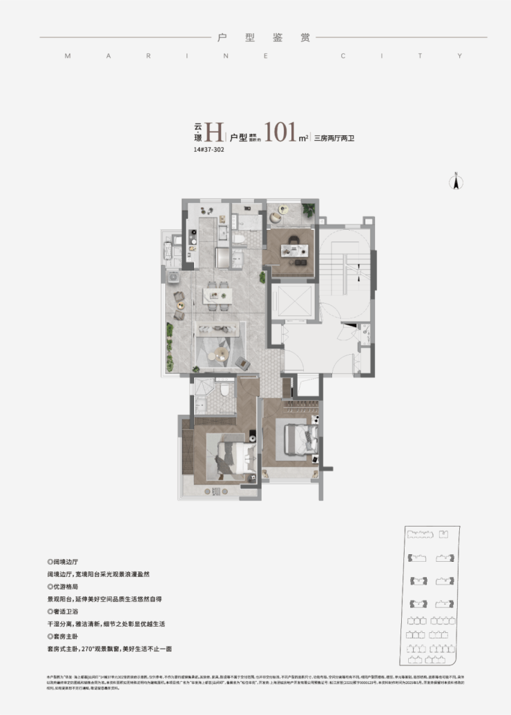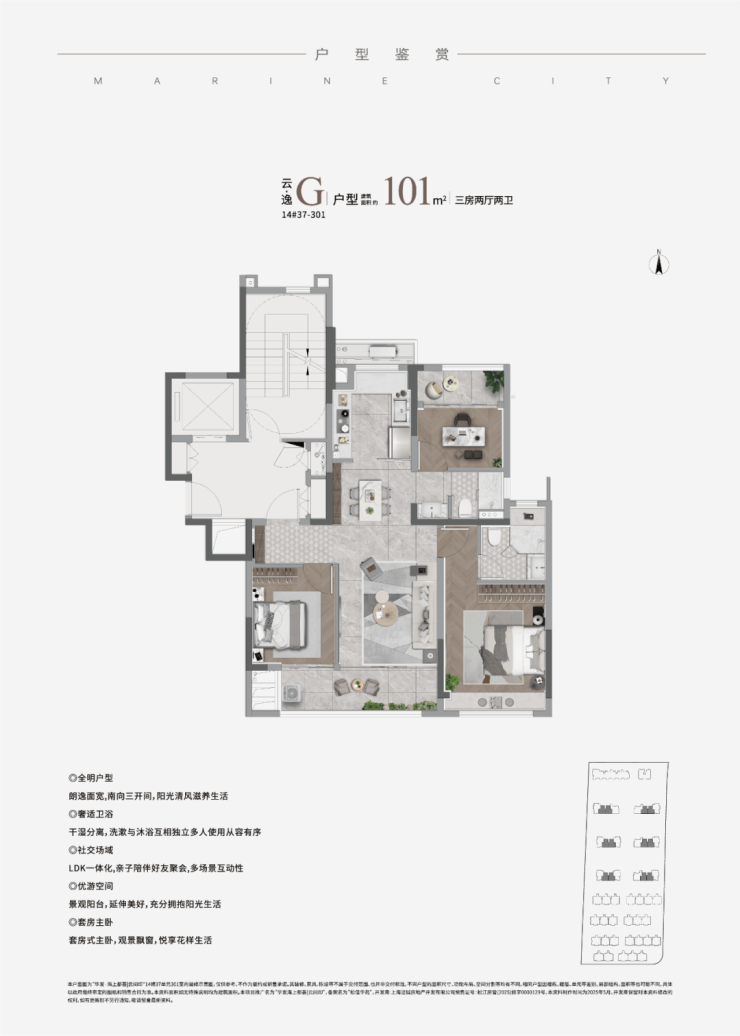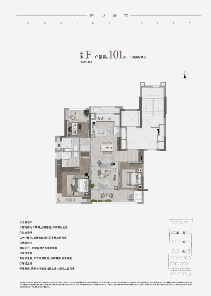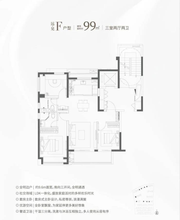 F户型:远·见 建筑面积约101㎡,三房两厅两卫