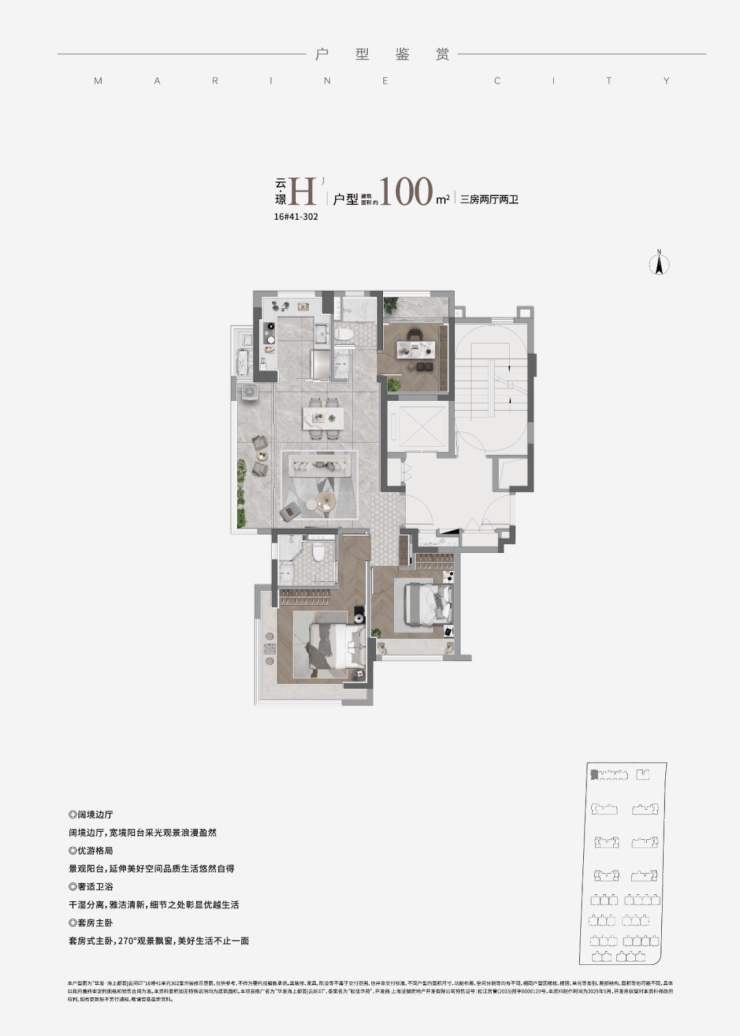 部分建面约100-101㎡H边厅户型,全景阳台搭配主卧L型转角大飘窗,三面采光+270°环幕视野,景观面堪比市区滨江顶豪,白天远眺松江人文,晚上看脚下星火流淌,十分惬意。