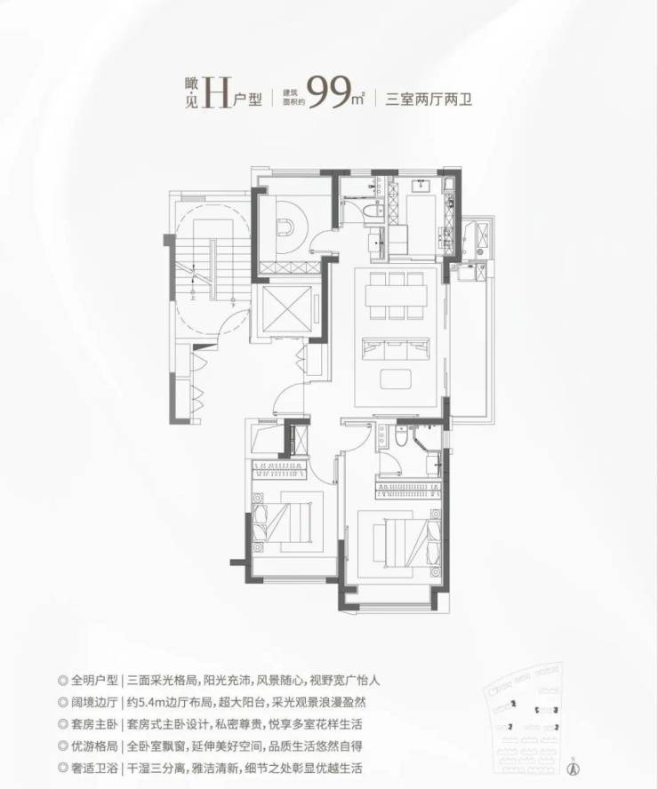 ②建面约99㎡H户型:三面采光,全能景观王炸边厅户型!