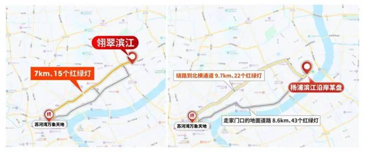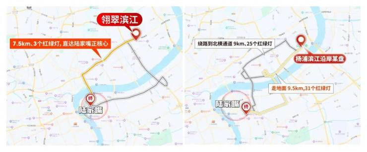 其他滨江一线的项目,想要去往浦东、浦西核心商圈,都要绕到翎翠滨江所在的片区,才能驶入快速路网。