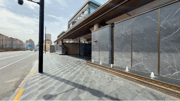 踏入社区的第一重礼序,便是项目打造的约45米一体化超尺度社区界面,近五米的挑高、近百米的宽屏尺度,辅以福鼎黑奢石整体铺装,第一眼就奠定了整个社区的奢雅基调。