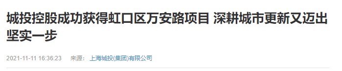 2021年11月9日,城投集团旗下的城投控股与虹口区人民政府共同签订了万安路地块国有建设用地使用权出让协议。