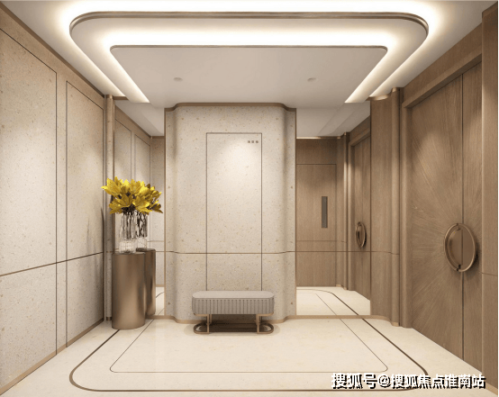 覆膜蜂窝铝板与局部石材饰面的巧妙搭配,285户型电梯厅以精致的材质肌理,演绎现代奢华的质感。