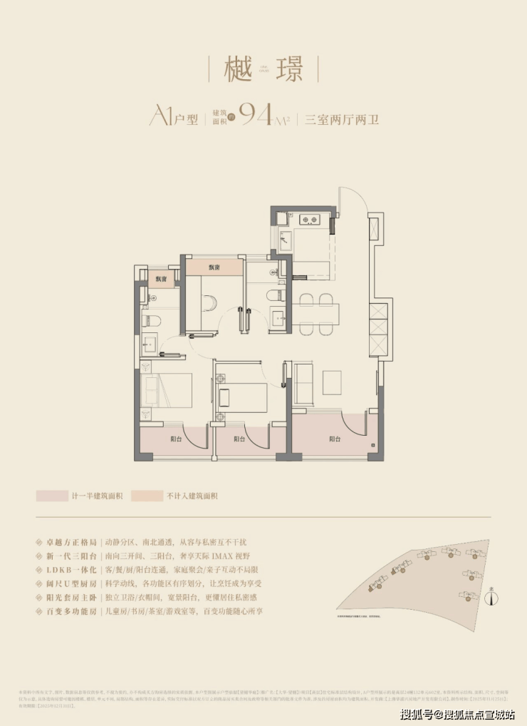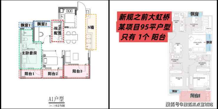 在这里,高层建面约94㎡户型做到了惊人的三阳台,对比同板块内以前的标杆小区,同面积段户型只做了1个阳台。不仅数量发生质的变化,实得面积也大大增加。