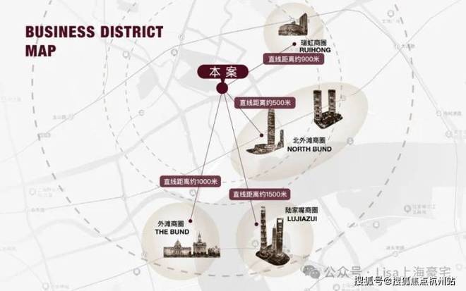 北外滩商圈直线距离约500米;外滩商圈直线距离约1000米;陆家嘴商圈直线距离约1500米;瑞虹商圈直线距离约900米。