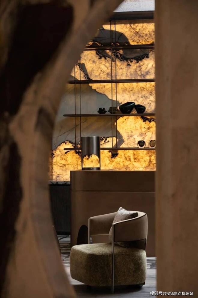 越秀·外滩樾的会所在地下三层。他们在会所中做了造型各异的奢石景墙,用各种隐约可见,来分隔和连接不同的功能空间。