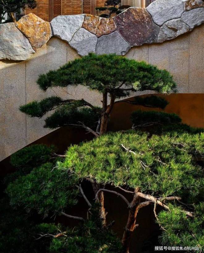 顺着旋梯而下,地下一层高约8米的双杆孪生连理松,与墙面上的原生山石皮,在你身旁环绕成了层峦叠嶂的意象。