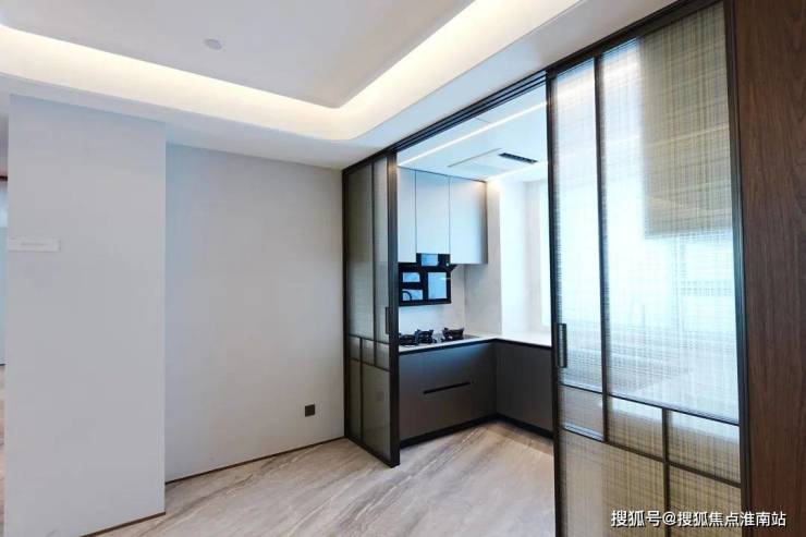 进门来看,凯迪仕智能门锁,木饰面通顶玄关柜,带海派拼花的地砖,全屋华为智能家居。客厅则是弧形转角的悬浮吊顶,无主灯设计,电视机背景墙也是大块的岩板。特别令小编这种“强迫症”很舒适的一点是,包括电视机背景墙在内,还有客厅地砖(简一的密封砖),全都是按照地砖花纹方向统一拼起来的,这种细节都非常讲究。厨房部分,大得不像是107㎡该有尺寸,据说窗口下方位置是飘窗,借一部分空间,因此整体操作空间大大增加,喜欢用小家电的业主,也有更多布置空间了。